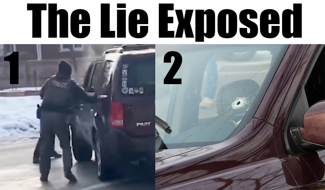 Picture 1: If the driver were trying to run down the ICE thugs, her front wheels would be turned to the left, not to the right. Watch the videos; she turns to the right trying to leave the scene. Picture 2: If the car was headed toward an ICE thug who felt his life in danger and fired at the driver, the bullet hole would be in front of the driver. But if the ICE thug were to the left of the car, the hole would be where it is. (He also fired two more times into the left side of the car.)